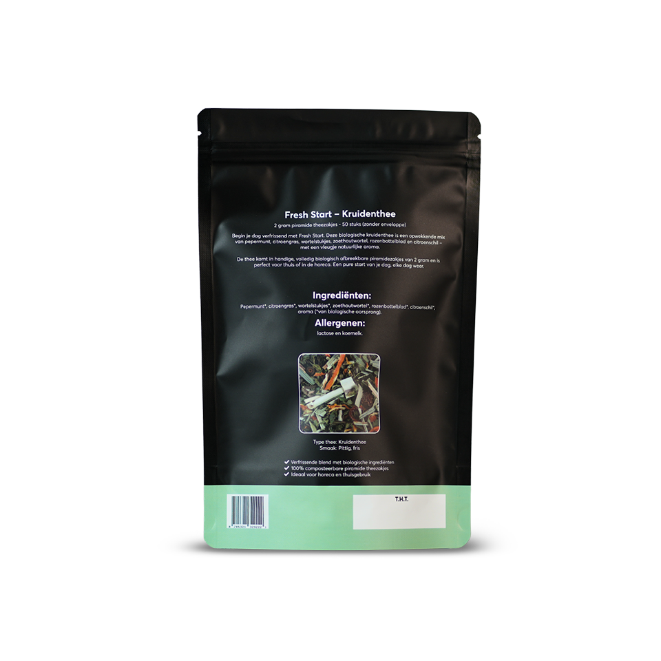 Enjoy a refreshing cup of tea with our Fresh Start, now available in convenient 2 gram pyramid tea bags. This special blend contains peppermint, lemongrass, carrot pieces, licorice roots, rosehip leaves, lemon peel and a hint of aroma, all of organic origin. These tea bags are sustainable: they are 100% biodegradable.